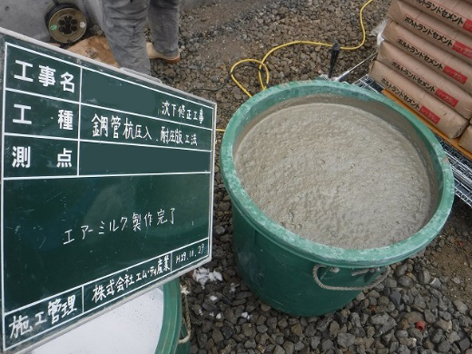 沈下修正工事で最もよく使用される鋼管杭圧入工法です。